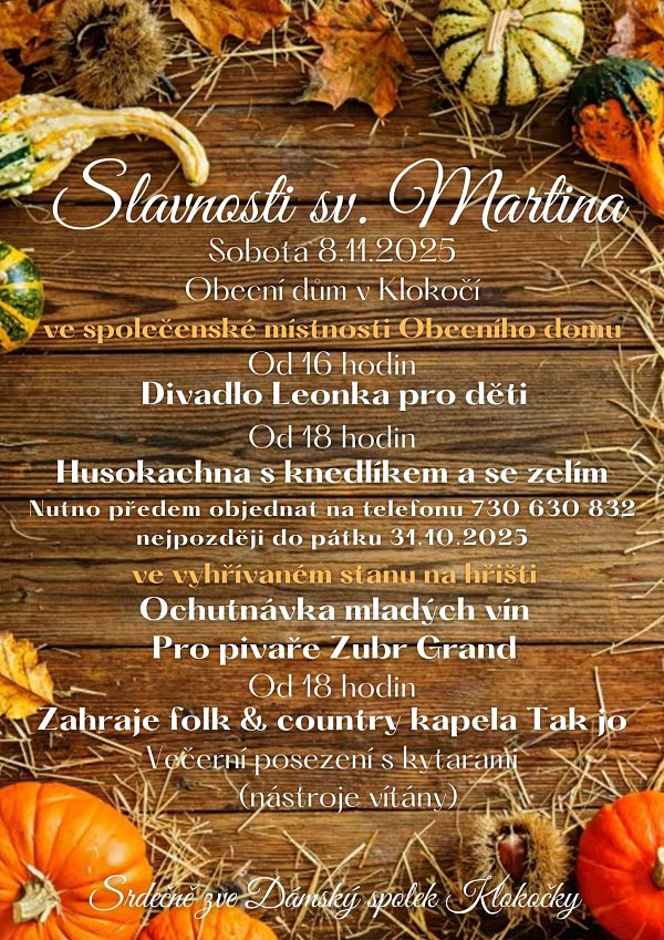 Dámský spolek Klokočky zve všechny na tradiční oslavu svátku sv. Martina, která se uskuteční v sobotu 8. listopadu 2025 v Obecním domě a na hřišti v Klokočí.